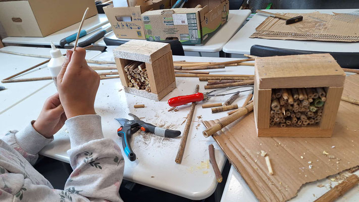 In der 5. und 6. Klasse des OHG Furtwangen (Otto-Hahn-Gymnasium mit Realschule) wurden im Rahmen von Projekttagen mit Unterstützung von 3 Lehrerinnen des OHG, sowie des NABU Schwarzwald-Baar in einem Wildbienen-Projekt kleine Bienenhotels gebaut. Hierzu wurden Bambushalme passend zugeschnitten und in entsprechende Rahmen eingesteckt.