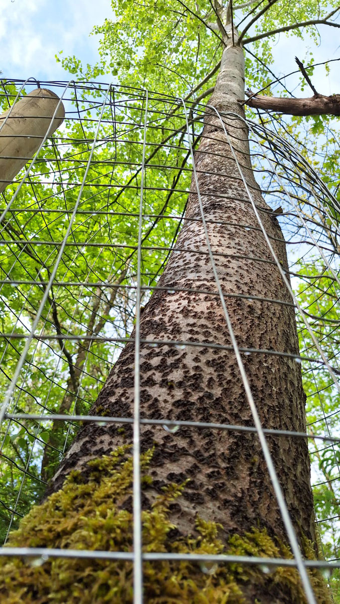 Zitterpappeln (Espen) sind wichtige Bäume für Insekten. In Mönchweiler brachte der NABU Schwarzwald-Baar Schutzdraht gegen Biber-Verbiss an.